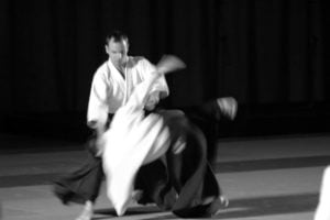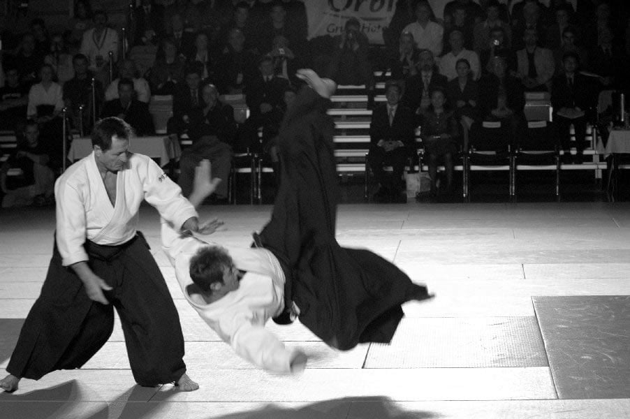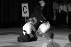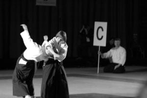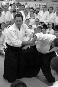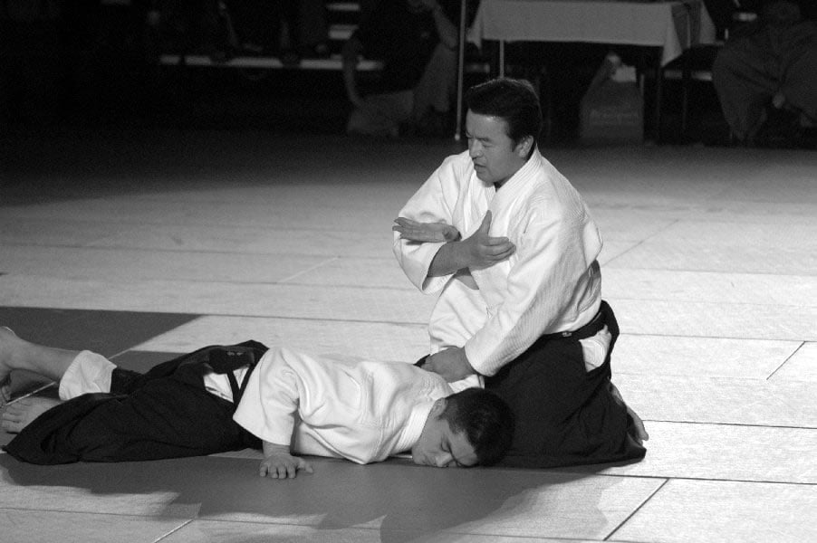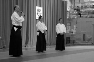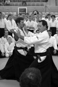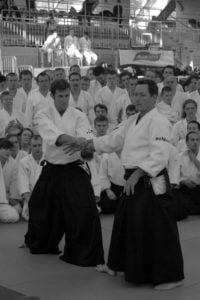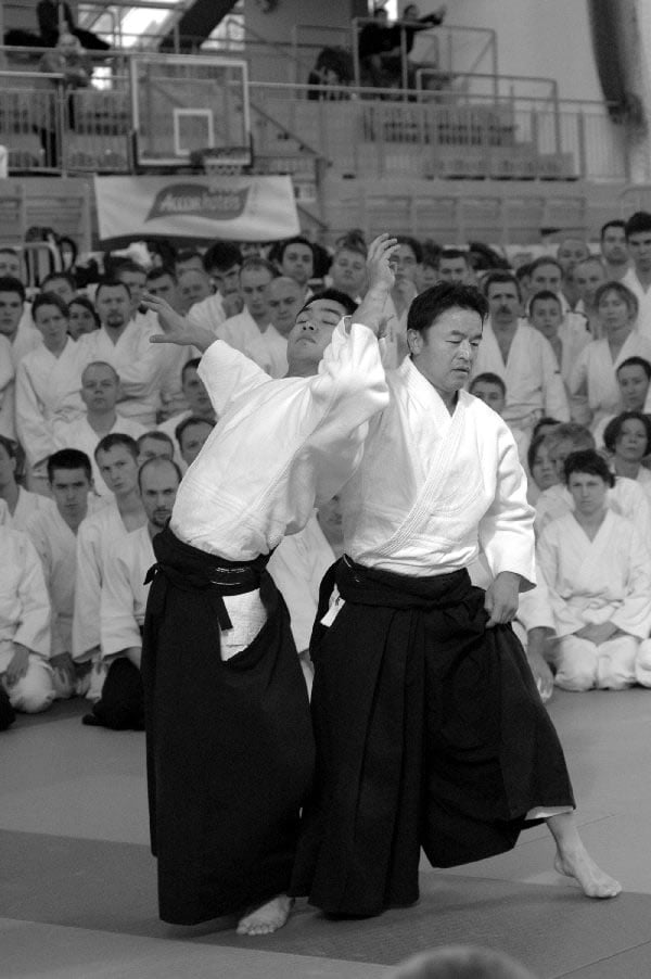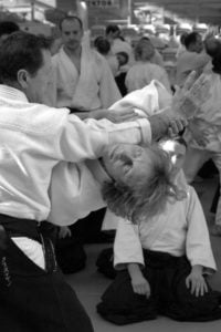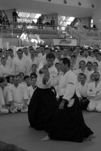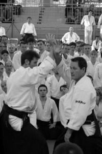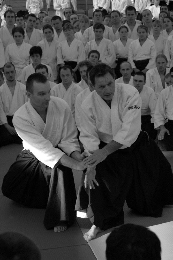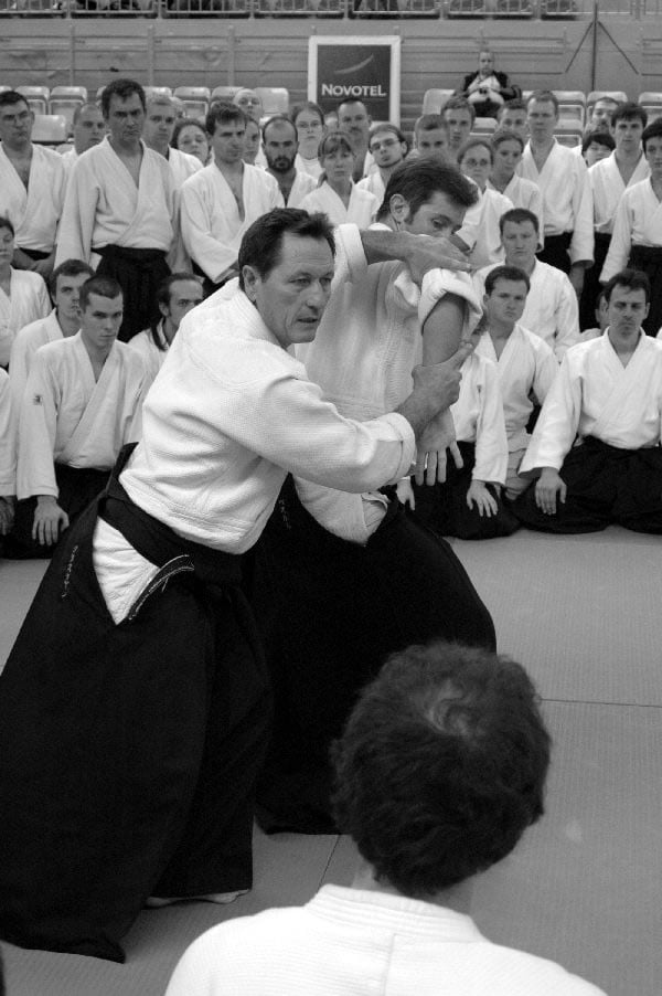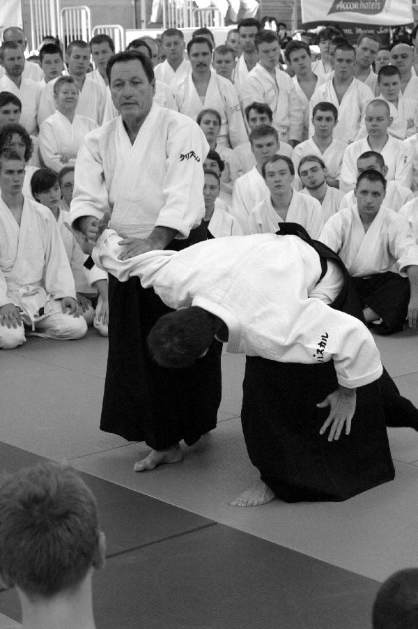 Sensei Christian Tissier miał zadanie częściowo uproszczone, gdyż zaczynał swoje zajęcia bezpośrednio po gościu z Hombu Dojo i byliśmy już solidnie rozgrzani. Tu także ćwiczyliśmy zupełne podstawy. Bardzo istotną treść treningu stanowiły wyjaśnienia na temat pracy na macie, zależności jakich przez odpowiedni system treningowy szukamy, zasad nad którymi pracujemy – zarówno jako tori jak i uke. Wszystko to było poparte odpowiednim pokazem. Mogliśmy się także przekonać, jak wygląda zastosowanie tych zasad w „praktyce” – jak wyglądają aplikacje technik. Sensei Tissier zwrócił jednak uwagę, że techniki zastosowań wymagają pracy nad podstawami przez długie lata. Na wyższym poziomie procentuje to niezwykłą ekonomiką i precyzją ruchu, znakomitym czuciem partnera i przede wszystkim możliwością swobodnego zastosowania technik. Trzeba jednak nad tym popracować do poziomu 3, 4-ego dana…
