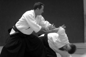 Pierwszy trening był dość łagodnym wprowadzeniem z zagadnienia stażu. Wyjątkowo podzielę się informacjami o technikach, które były ćwiczone, ale szczegóły egoistycznie i tak zachowam dla siebie. Tak więc była najprostsza kokyunage z ataku katatedori, nieśmiertelna ikkyo w wersji omote i ura z ataku katatedori aihanmi oraz kokyu ho. Nie pracowaliśmy tu jednak na poziomie podstawowym, ale nad detalami, które „ułatwiają” wykonanie techniki i tak naprawdę stanowią o jej efektywności. Szczególnie przy ikkyo sensei pokazał dość szczegółowo pracę obu rąk, pracę na stawie łokciowym uke i. wokół niego. Poza tym dla małej odmiany ciekawostka: wykonanie ikkyo ura na partnerze usztywniającym ramię w łokciu. Przyznam, że bardzo było mi trudno jako uke nienaturalnie blokować całe ramię, a odbiór techniki był zdecydowanie nieprzyjemny, zaś sprowadzenie na tatami odbywało się szybko i niewygodnie. Niektórych zapewne to zdziwi, ale z punktu widzenia tori założenie ikkyo na tak usztywnionym tori było łatwiejsze. To może dać nieco do myślenia.