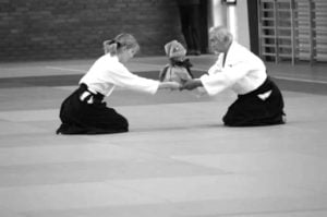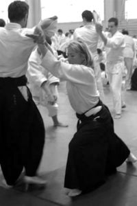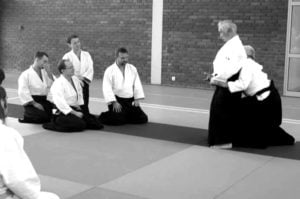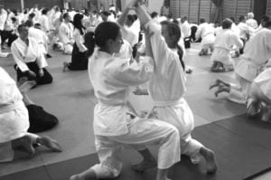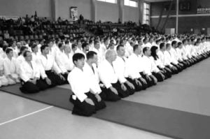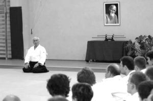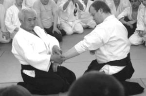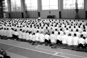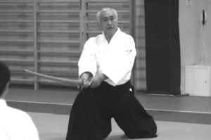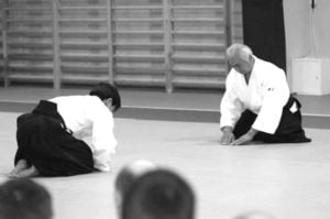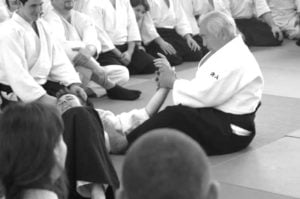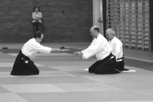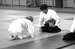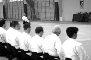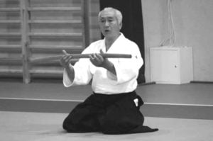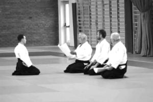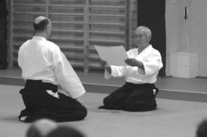 Znacznie więcej skorzystałem na drugim treningu. Pierwszą jego część stanowił wykład na temat etykiety w aikido. Wykład bardzo ciekawy i. miejscami dość zaskakujący. Była zatem nauka ukłonu w seiza (czy aby wszyscy wiemy jak kłaniać się poprawnie?), wstawanie do tachi, były zasady obchodzenia się z bokkenem i sposób odbierania certyfikatów. Wspomnę o tym co lekko mnie zaskoczyło. Wstawanie z seiza do tachi waza Isoyama Sensei proponował rozpoczynać od lewej nogi. Taki sposób wynika z faktu, że wstając z lewej nogi nie można od razu wykonać cięcia mieczem, a więc jest to symboliczne potwierdzenie faktu, że aikido jest w swych podstawach sztuką walki skrajnie defensywną. Nieco też zdziwiło mnie odkładanie miecza po lewej stronie, a nie jak jestem do tego przyzwyczajony, po stronie prawej. O interpretację tego faktu niestety nie zapytałem, a szkoda.