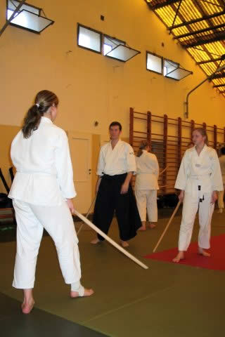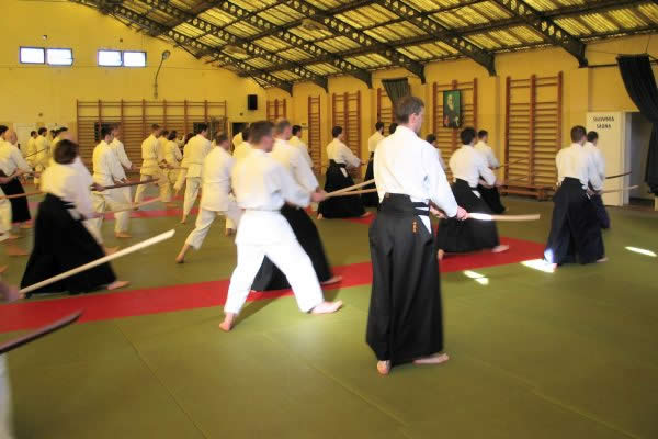 Na stażu nie zabrakło również treningów z bokkenem, a ich poziom był dostosowany do osób początkujących. Nie oznacza to, że bardziej zaawansowani mogli się nudzić. Treningi wymagały zaangażowania i dokładności w ruchach bazowych, a treningu podstaw jak wiadomo nigdy za wiele. Wykonywaliśmy zatem podstawowe cięcia – shomen i kiri kaeshi. Uczyliśmy się podstawowych zejść z linii ataku i kontrataków. Pracowaliśmy też nad dystansem i timingiem.