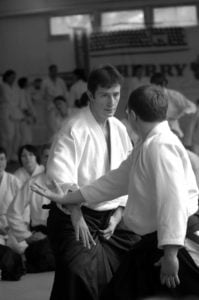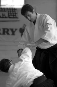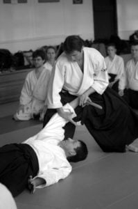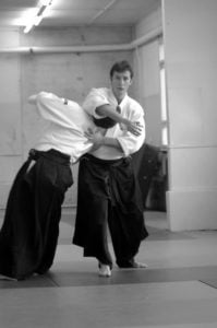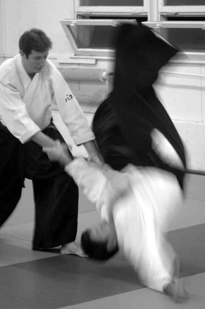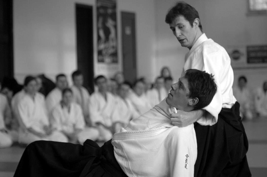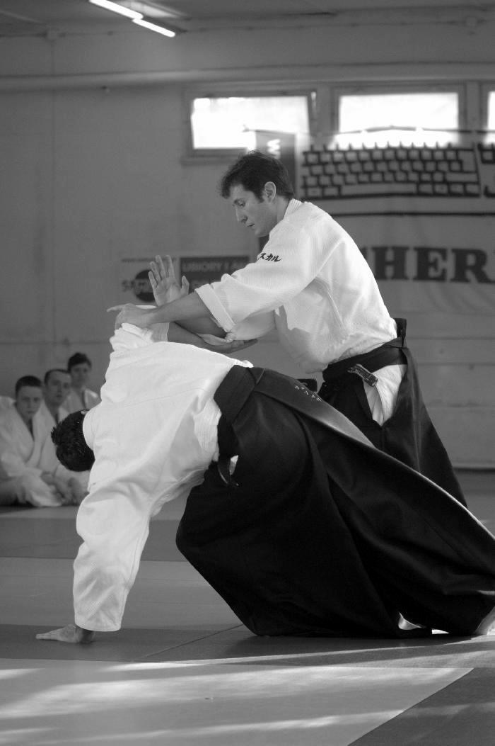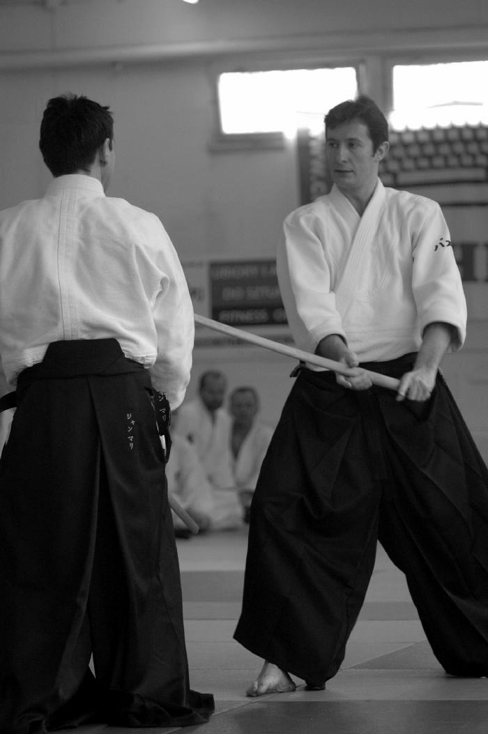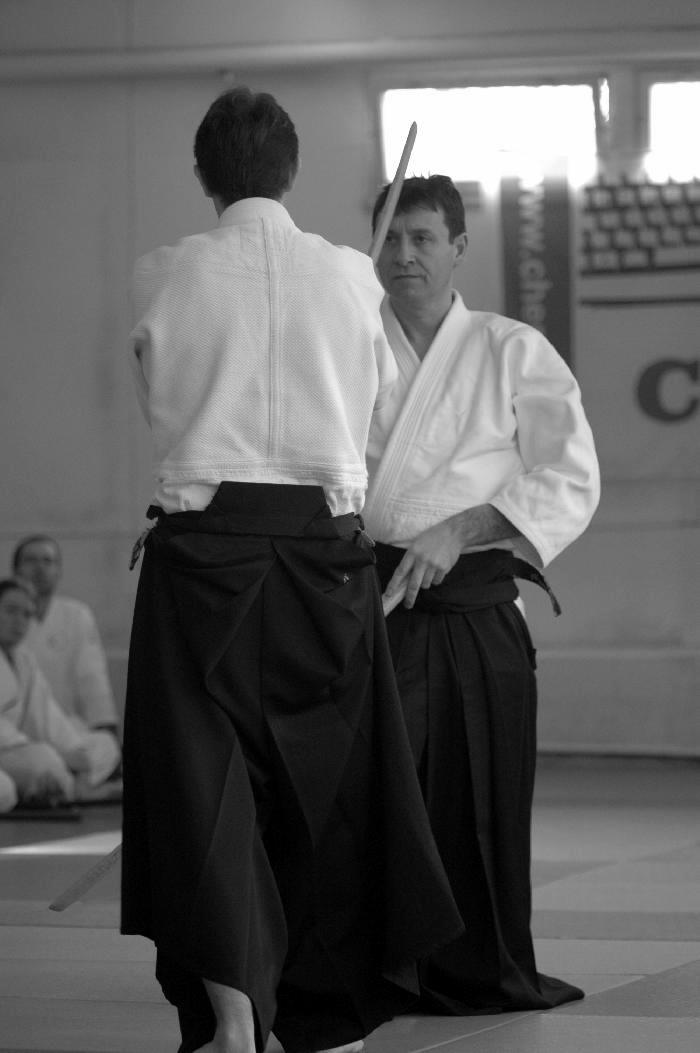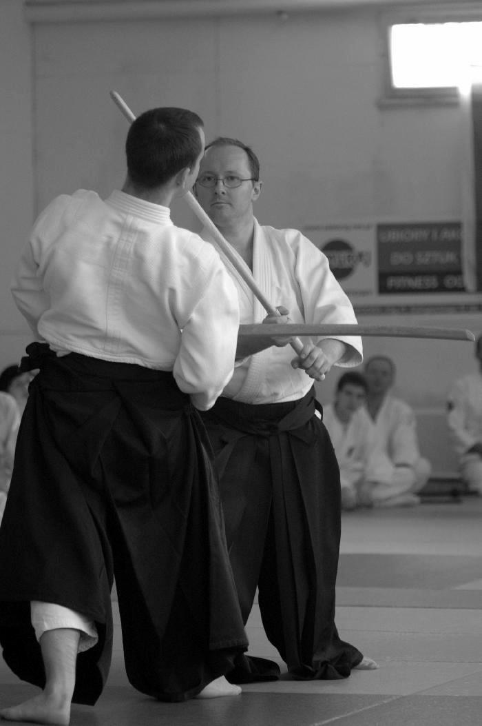 Sensei Guillemn w znakomitej formie rozpoczął od podstawowych technik z ataku yokomenuchi. Dalej pojawiały się „klasyczne” stażowe ataki takie jak katatedori, czy katatedori aihanmi. Sensei zwracał uwagę, że mimo braku realności takowych, konieczne jest zachowanie logiki i sensu każdego z nich. Rzecz jasna stanowią one bazę do prawidłowego wyprowadzania innych ataków, stąd konieczne jest odpowiednie ich traktowanie i właściwe podejście. Nieco miejsca poświęcone było również atakowi rzadziej na stażach spotykanemu a mianowicie katadori. Ćwiczyliśmy mało standardowe zejścia i dalej kontrolę partnera przez ikkyo i nikyo. Była także ciekawa wersja uchikaiten nage rozwinięta z… a co ja tyle będę pisał. Trzeba było pojawić się na macie ;-).