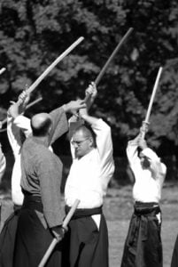 Środowy trening sensei Sapieli bardzo ciekawy. Trening z bronią: tanto, bokken i jo. Mogliśmy w czasie tego treningu inaczej spojrzeć na znane nam już techniki, zajmując się bardziej całością sytuacji, niż samym tylko tanto czy bokkenem. Mnie osobiście bardzo ten trening przypadł do gustu i dał nieco szerszą perspektywę. Niestety podczas tych zajęć mój staw skokowy powiedział „nie” i kolejne dwa dni przyszło mi grzać ławę.