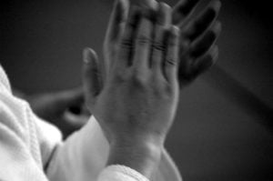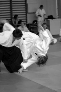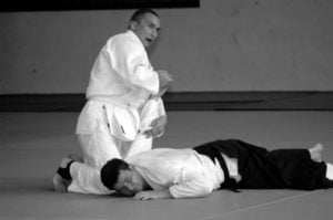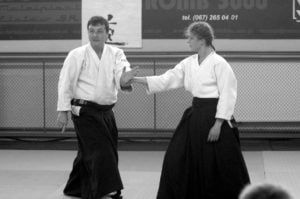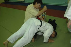 Swoje „gościnne” treningi mieli również sensei Jerzy Pomianowski i sensei Roman Hoffmann, którzy tylko na krótko odwiedzili naszą Szkołę. Niestety na tych treningach nie poćwiczyłem, gdyż poprzedniego dnia ze zbyt dużym poświęceniem broniłem honoru naszej polskiej siatkówki w meczu z francuskimi kolegami. Poziom ligi światowej z pewnością to nie był, za to kolana miałem zdarte pierwszoligowo.